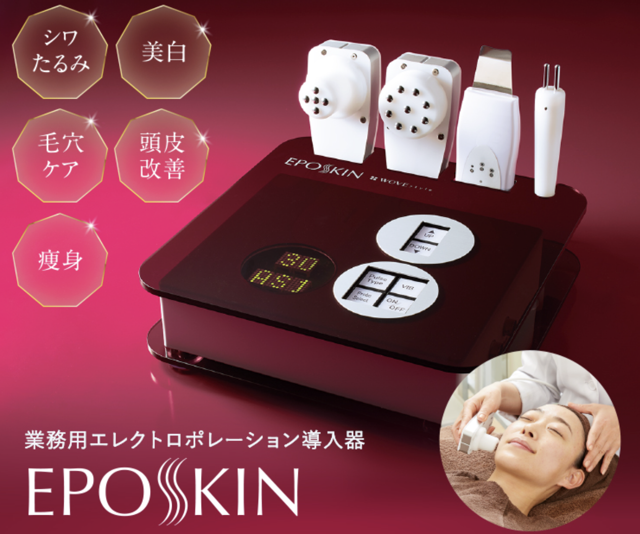 EPOSKIN 781,000円 ポレーション/超音波クレンジング/イオン導入 ハンディ型 × 顔/体/頭皮 推奨製品あり 全身対応・高単価向け